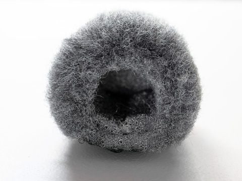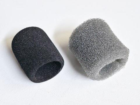 左がオリジナルの風防で、右が今回用意した粗目のスポンジ。板状のものをマイクに合わせてコップ形に加工した。これがウインドジャマーの内部に空間をつくる。オリジナルのウレタンスポンジでも良いが、ジャマーと併用するとどうしても高域が落ちてしまう。