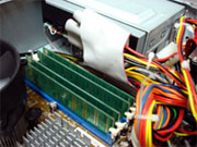 メモリーはPC3200/256MB4枚=1GBを装着した。筐体が小さいのでDVDドライブの下にソケットがある。写真はドライブを半分ほど抜き出した状態だ。