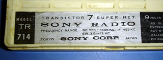 裏蓋を開けると機種名TR714の他、TRANSISTOR 7 SUPER HET.と書かれ、トランジスタが7石使用されていることがわかる。SUPER HET.とはスーパーヘテロダイン方式のことで、真空管の7球スーパーといったところだろうか。5球スーパーよりも高性能な気がする。スーパーヘテロダイン方式とは受信周波数に対して局部発信を合成し、一種の「うなり」現象によって中間周波(AMでは一般に455kHz)に変換後増幅、検波する方式である。高周波を広帯域に増幅するよりも効率がよく、AM、FMラジオの標準になっている。ラベルに周波数が書かれているが単位はKC(キロサイクル)である。当時は人名に由来するHz(ヘルツ)は使用されず、周波数単位のサイクルが使用されていた。