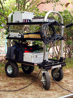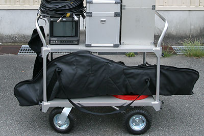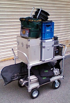 とは言っても、やはり機材庫に1台は欲しいマグミッチカートであることも確かだ。財源さえあれば物欲に走りたくなるほど完成度の高い台車ではある。そこで私の会社でマグミッチの代りに導入した大径エアータイヤのアルミ二段台車がこれだ。マグミッチカート同様に、既製のアルミカートを改造して作ったものである。