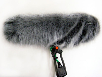 フェイクファーの生地を買ってきてオリジナルの型に切って縫製した。製作コストは市販品の1/10以下で出来上がった。効果は抜群で、ハイ落ちも無い。風の強い屋外での音声収録では必需品である。