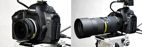 左がNikkor 16mmF2.8S、右がAi AF Zoom Micro Nikkor ED 70-180mmをEOS 5Dに取り付けたもの。もちろんD3やD700で使用できる。物撮りの際に単焦点レンズでは頻繁にカメラと物の距離や三脚の高さ調整が必要になるが、このズームマクロを用いることでアングルを変えないで商品のサイズを変更できる。もちろん描写は簡易マクロではなく本物だ。