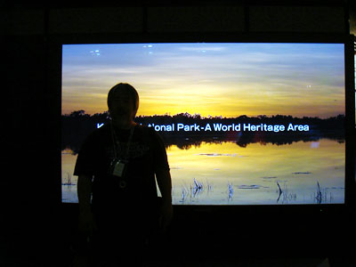 100吋のプラズマだ。隣に150吋もあったが、MCが居たので100吋の前で写真を撮った。搬入、搬出を考えてまず重さを尋ねた。100吋でパネルが200kg、土台が200kgだそうだ。職業柄仕方ない。で、肝心の画質だが、綺麗だ。逆に言うと素材の周辺解像度の低さが気になってしまった。こういうサイズで使用するハイビジョンコンテンツを作るなら、やはり1920×1080のキャメラとハイグレードなHDレンズが求められることを再認識した。