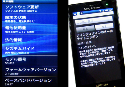 設定から更新されたバージンを確認し、データの損傷や不具合が無いかを確認したが問題は無かった。このエクスペリアでよく使うメールやアンドロイド、SPBTV、そしてIPラジオのRazikoなどを検証した。Zazikoはいつも楽しみにしている関東圏のラジオ放送を問題なく聴くことが出来た。オールナイトニッポンでは先日復帰した岡村さんが元気に喋っていた!アンドロイドのバージョンアップも嬉しいが、岡村さんの復帰はそれ以上に嬉しかった。