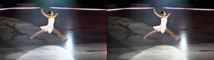 1920×1080の画面に2つの映像をスクイーズして合成しているためにアスペクトはそれぞれ縦長になっている。左右(水平)が圧縮されていても上下(垂直)の解像度は1080ピクセルであるためHDとしての解像度は確保しているということだろう。普通のアスペクトに直すと下の写真のようになる。上手く出来ると空中に浮かんで見えるはずだ。