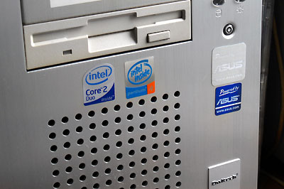 マイクロソフトのプロダクトキーを貼ったオウルテックのシャーシをそのまま流用したため、以前に貼ったPentium4やASUSのソケット478用のボード添付のステッカーはそのままにしておいた。ステッカーがぺたぺたと貼られた雰囲気がレースマシーンのようで気に入っている。