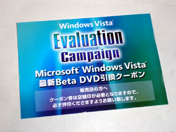 先日購入したXP Professionalだが、現在Professional版はキャンペーン中で、次期OSのWindowsVISTAのベーター版をもらえる。もらったクーポン券には今春準備出来次第に交換と書かれているが間もなくである。