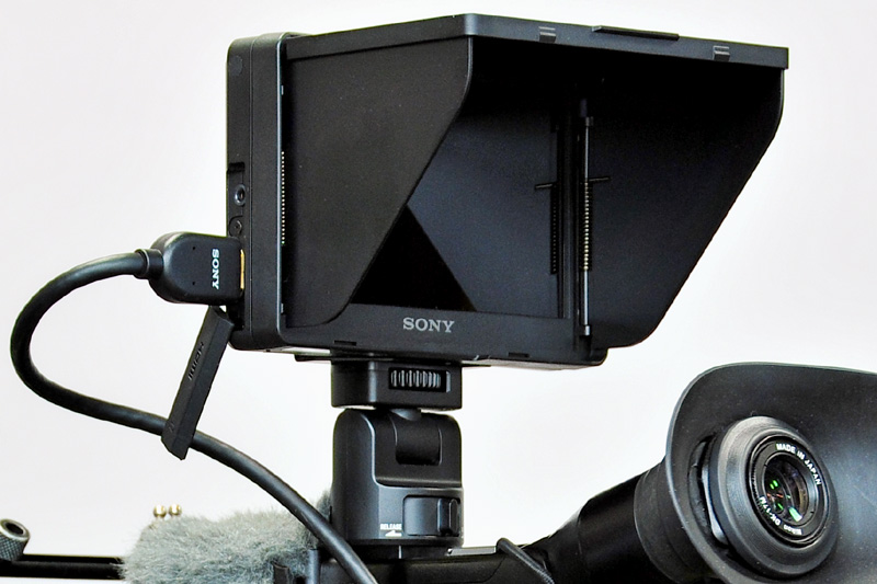 ソニーから発売されたHDMI入力の5吋モニターのCLM-V55である。ソニーのα55やNEX-VG10用として開発されたもので、モニターというよりはファインダーとしての機能が盛り込まれている。カメラへの取り付けはソニー専用のアタッチメントの他に、EOS7DやNIKON D7000他に対応できるように汎用のアクセサリーシュー用アタッチメントも付属している。またワンタッチで開くサンシェード(モニターフード)も付いている。若干浅いが屋外でも十分役立つし、ブラックメタルをパーマセルで貼り付ける手がかりとして深くすることも簡単だ。