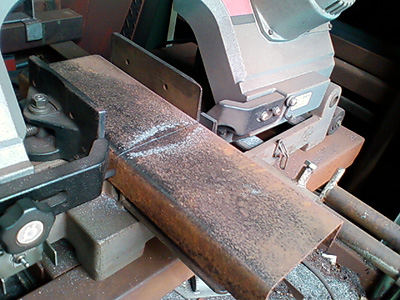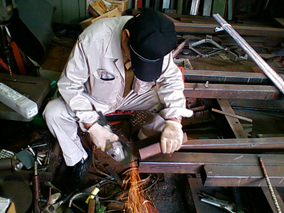適当な材料の中からスタンドの台に丁度いいものを探して必要な長さに切断。鋼材の厚みは4mmあり、こんなものは自分では絶対に切れないがさすがに鉄工所である。羊羹を切るようだ。この時の様子をキッズ携帯 F-05Aのカメラで撮ってきた。
