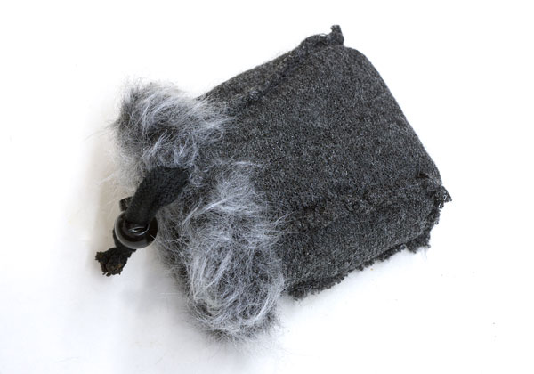 ECM990Fに合わせて裁断したフェイクファーを袋状に縫って綴じ紐をトうせるようにした。約1時間の作業。出来上がったワンポイントマイクジャマーがこれ。↓