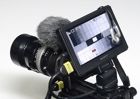 収録時の音声モニターだ。NEX-5Nの外部マイクを装着したときにHDMIの小型モニターCLM-V55を経由することで音声のモニターができることに気づいた。HDMIのデジタル信号がアナログ音声に変換され、音量はCLM-V55で行える。内臓スピーカーではハウリングを起こしてしまうので、再生時とはちがってヘッドフォンやイヤフォンでのモニターになる。