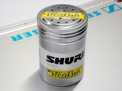 ただし調味料缶のままでは格好が悪いのでSHUREのロゴをネットで落として作ったロゴ入りのテプラを貼っておく。