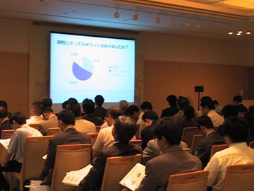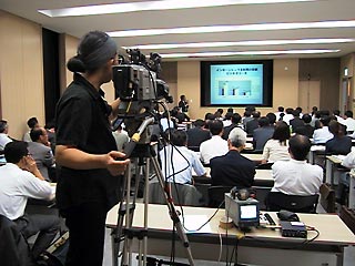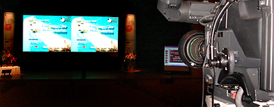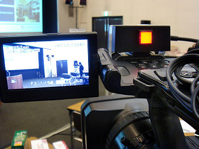 HDVカムコーダーのHVR-Z1Jを3台、ライブスイッチングを行いながら、HD16:9ワイド画面をSD16:9にダウンコンバートして中継した。回線はTV会議の回線を使用したが、一度も途切れることなく送ることが出来た。決して高画質ではないが、TV会議のシステムの映像や音声に比べると、やはり我々が作る映像や音声は圧倒的に優れたものになる。「同じ回線でこうも違うのか」ということで、送り先は大型スクリーンに映し出されていた。