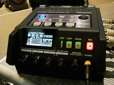 本来音楽録音に使うためのレコーダーだが、私の会社では最近レコーダー兼ミキサーでの使用が多い。写真は東京で芝居の公演を収録した時のもの。舞台に設置したアムクロンのマイクとSE系の4CH録音だ。アムクロンにはR-44からファントム48Vを送った。これも便利な機能だ。4CHは独立した4ファイルにすることも出来るが、ステレオを2系統にした2ファイルの4CHも設定できる。どちらかといえば我々の仕事にはこちらの方が便利だ。