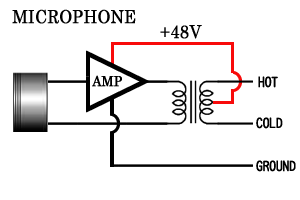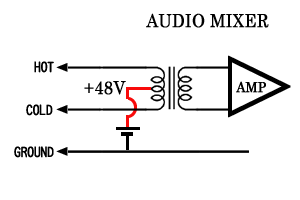 下の図のようにオーディオミキサーの入力トランス中点に+48Vを加え、GROUND=シールド側を接地とした電源供給だ。そのために入力端子のHOT-COLD間には電圧は発生しない。これがファントム=幽霊、つまり電圧が見えない電源供給の由来である。ファントム電源がもしリップルを含んでいてもマイク端子のHOT-COLD間には電位差としては現れないためハムを生じることも無い。また、間違えてダイナミックマイクを接続した場合もマイクを破損することは無い。最近ではトランスを用いない電子バランス回路が採用され、ダイオードを使った供給方式も多くなったが基本的には同じ考え方である。