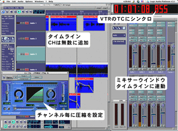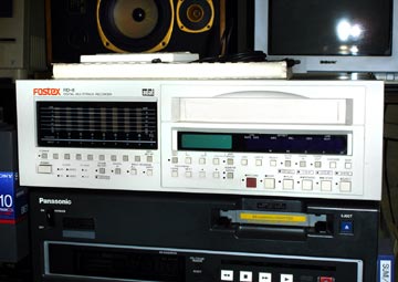 映像を編集するには現場の同録音声だけでは出来ない。音楽や効果音など、様々な効果が必要になる。上の写真はMA編集に用いるLogicのデスクトップだ。映像と同時に流れる音声のトラック数は完成版では基本的に2トラックになるが、編集時は同録2ch音楽4ch、効果音2chは最低必要になる。コンピューターを使うまではアナログマルチトラックレコーダーやADATのようなデジタルMTRを使用した。SVHSテープを使用するADATや、DA-88のように8mmビデオテープを使うマルチオーディオテープレコーダーはビデオのタイムコードを追いかけるチェイス機能があり、ビデオと同期した音声トラックが得られた。写真は弊社の編集室にあるFOSTEXのADATだ。