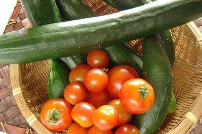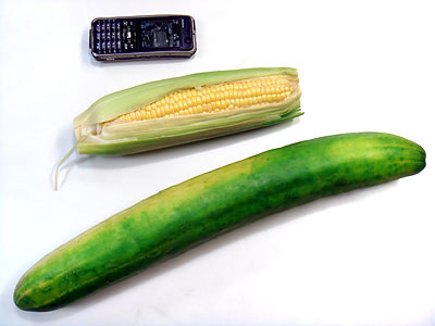 「あれはまだまだ小さいよ」といわんばかりに、再び巨大なキュウリを数本いただいた。今度のキュウリは前の1.5倍はあるだろう。すでに2本は塩もみにして食べてしまったが、最後に残しておいた一番大きなキュウリを写真に撮った。