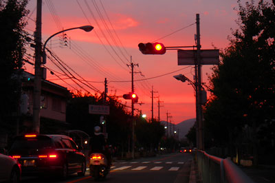 事務所の前の交差点だ。信号機やテールランプに負けない真っ赤な空だ。