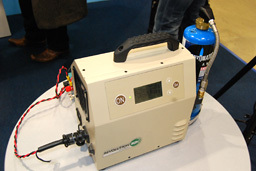 ASAHI.COMによると東京貿易機械(東京都中央区)は、家庭用ガスコンロのボンベを使う「ポータブル燃料電池」を出展した。欧米で市販されているプロパン缶1本(約400グラム)を取り付けると50Wの発電が始まり、14時間稼動する。屋外ロケ用のカメラや照明などに使うことを想定している。燃料補給の手軽さや騒音の静かさ、クリーンな排気が売り物だ。日本の家庭用コンロとして出回っているブタン缶に燃料を変更し、電力を100W仕様にした製品を開発中。 ということでこれが東京貿易機械のポータブル燃料電池だ。