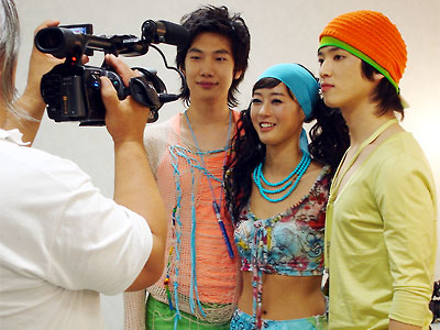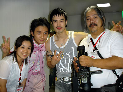 写真は今日なんばHatchで行われた「K-POP MUSIC FLOWER 2006 SUMMER」取材のひとコマだ。番組は4CAM/EFPとこのHDVのキャメラで撮影した映像で構成され、9月7日にスカパーのM-netで放送される。私と一緒に写っているのはノラゾ(ノラジョ)のイ・ヒョクさんとチョ・ビンさん。そして通訳の金民樹さん。他にも「バラードの皇太子 Tei」キム・ホギョンさんやBANANA BOAT、LUGといったアーティストを取材した。韓国の人はファンを大事にするとは聞いていたが、メインゲストのTeiさんはじめ、全ての出演者のファンを大切にする気持ちを目の当たりにした。↓下の写真はBANANA BOATの3人。