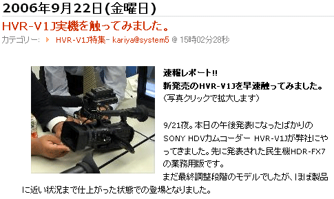 先日美容専門学校の学校案内を撮影したがやはりHDV+特機を用い、さらに高価なHMI照明も使用した。それでいて予算は従来のベーターカム特機なし程度である。HDVの真価を発揮した作品はクライアント、代理店からも高い評価をいただき、改めてHVR-Z1jのポテンシャルの高さを痛感した。この作品は携帯サイトで配信されているが、AUの小さな液晶でも高精細な動画を見ることが出来た。