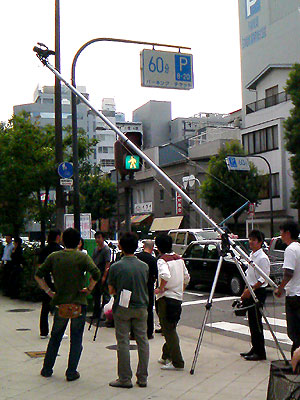 写真は昨日大阪市内で見かけたVPの撮影現場(他社)を偶然通りかかった私のスタッフがFOMAで撮影してくれたものだ。見るとABC PRODUCTSの軽量クレーンが使われ、先にDVX-100が付けられているのがわかる。*左の2名は何処と無く私が良く知る人物(照明&特機の会社)に似ているようだ。