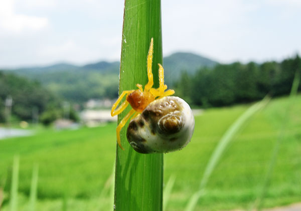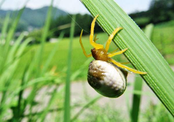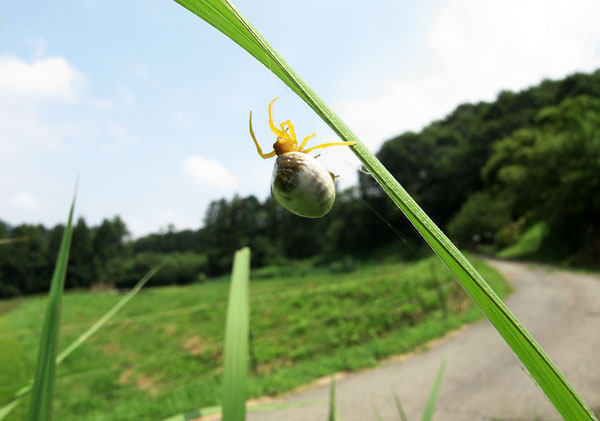 盆の最終日は近場の里山で過ごした。休んでいるところで妻が面白い蜘蛛を見つけた。