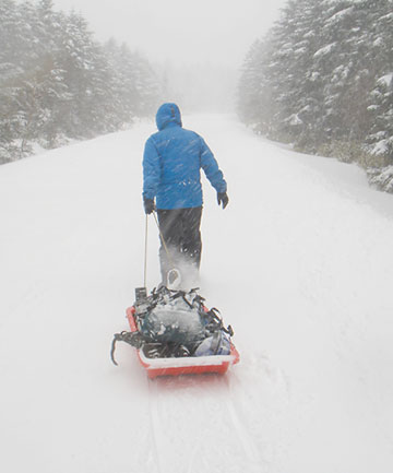 犬ゾリならぬ人ゾリに荷物を積んで運ぶ木原。担ぐよりも遥かに楽だ。私が25年ほど前に来た時も同じスタイルだった。荷物はビデオ機材とスチル機材、そして私物。