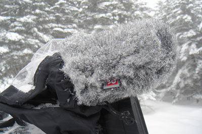 ガンマイクのジャマー。風が強いのでジャマーが無ければまともな録音は出来ない。しかしレインカバーから露出している部分はすぐに凍りついいていく。