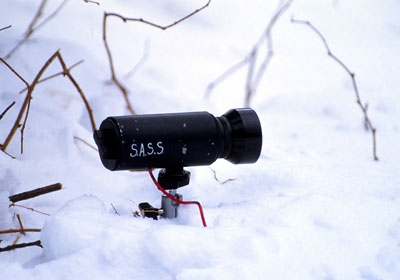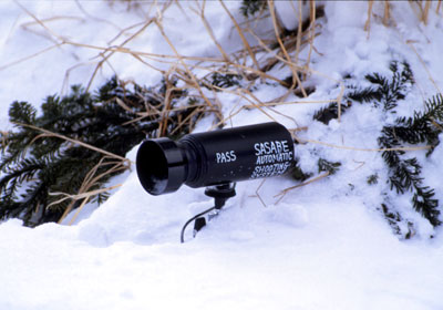 上の写真は赤外線の発光器を入れた投光部である。そして下が受光部である。設置が簡単な反射式は雪や雨の影響で誤動作が多く使い物にならず、送受分離式のものが確実に動作した。