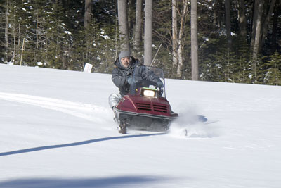 閉鎖された国道をスノーモービルを使って機材を運んでいる。当時に比べるとかなり気楽な山行である。