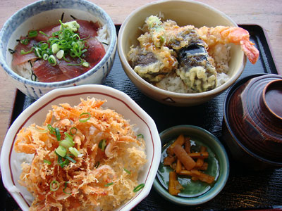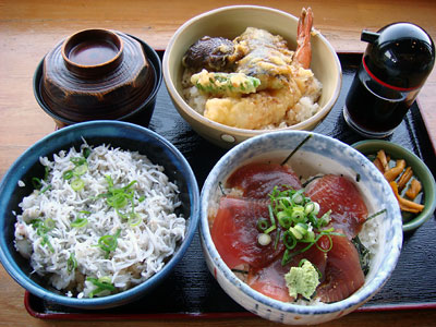 昼食はお決まりのミニ丼三色セット。マグロの漬け丼、さくら海老の掻き揚げ丼、天丼のセット。