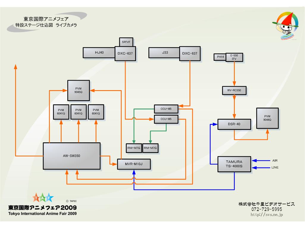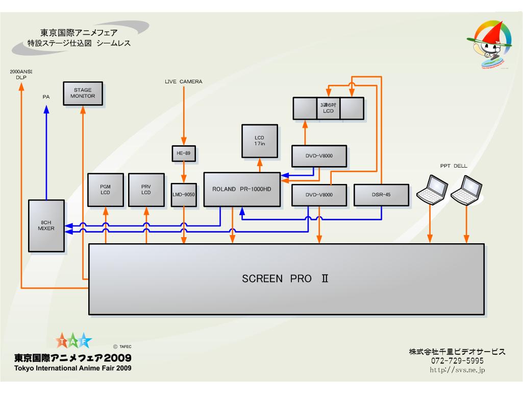 食べてばかりのように思われては具合が悪いので仕込図をアップしておく。上が特設ステージのライブカメラで、下はシームレススイッチャーのブース。図面には入っていないが全てのフォーマットに対応するためそれぞれのブースにローランドのビデオフォーマットコンバーターVC-300HDを用意した。VC-300HDの製品紹介ムービーは昨年我々が撮ったものである。