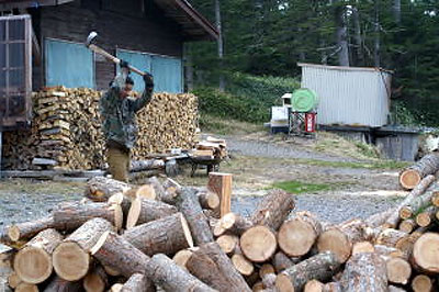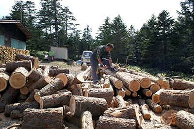 通年営業するということは冬季の暖房をまず第一に考えなければならない。山小屋ではすでに冬支度が始まっている。チェーンソーで落葉松を切っているのがオーナーの島立正広、私の親友である。