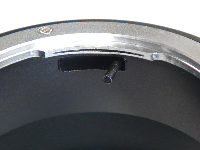 アダプター内部の絞り駆動用のピン。リングと直結されているのでリングの回転角は小さいが、適度なフリクションがあるので希望する深度になる場所で問題なく止まっている。絞り環が付いたニッコールレンズの場合はレンズの絞り値をセットしたまま、ワンタッチで開放に持っていくことが出来る、云わばプリセットボタンのようなことも出来る。