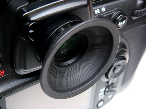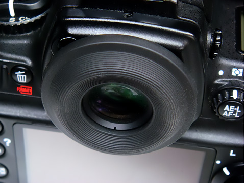 写真はNIKON D700にマグニファイングアイピースDK-17Mと【接眼目当て DK-19】を取り付けたもの。マニュアルフォーカスのNIKON F3Pなどではファインダー画像のボケ量が大きく、ピンボケがとてもよくわかるが、新しいカメラではオートフォーカスが主流のため、ボケよりもファインダーの明るさに重点が置かれているのでピントの山が掴みにくい。