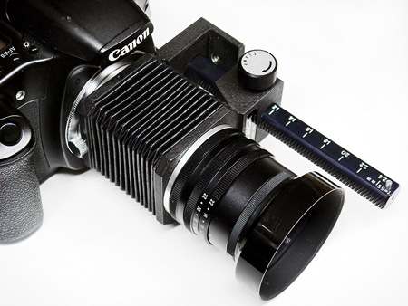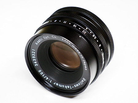 使用しているレンズはアサヒペンタックスのBellows-Takumar 1:4/100mmで後にSMCとなったが、これはマルチコーティングされていない旧タイプで絞りはプリセット。EOSに付けるととてもコンパクトで、ベローズ専用レンズの100oは∞までフォーカスが合う。