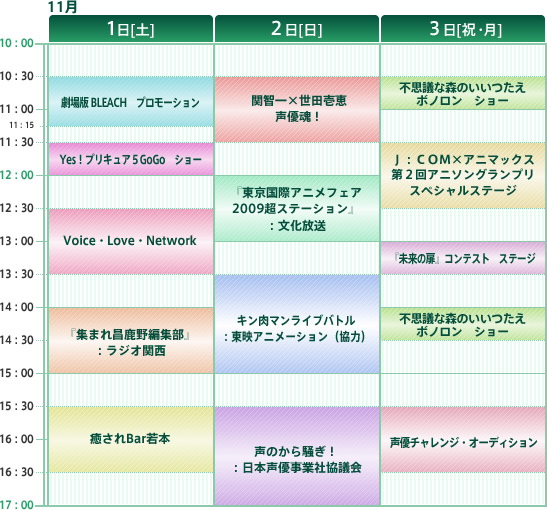 協力 日本声優事業社協議会、東京国際アニメフェア実行委員会事務局 3日間のステージスケジュールは下表(クリックすると拡大)