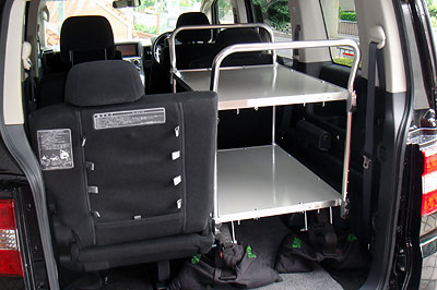 この台車をデリカD:5に積むとこうだ。(以前に掲載した写真を流用したため、若干仕様が異なっている)次の写真のように見事に納まる。