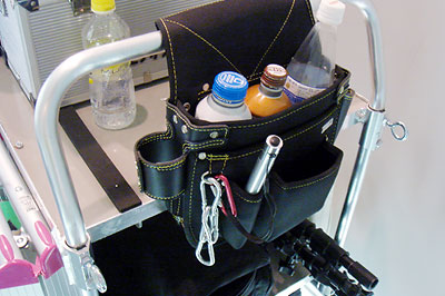 サイドのフックによってワンタッチで脚立が搭載できる仕組みはスタッフのアイデアだ。そして両ハンドル式だが、どちらも同じ方向にしているのは、デリカD:5のサード座席1席のスペースに積載した時、セカンド座席の乗客の頭が取っ手に当たらないためだ。またこれによってマグパッチカート積載時にセカンド座席をノッチ一つ分下げることが可能になる。