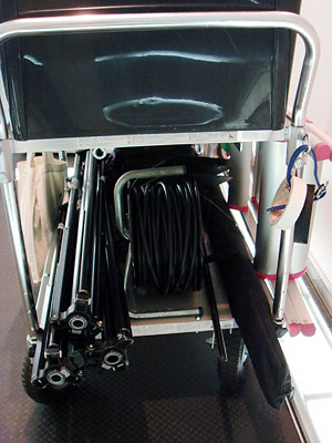 二段台車の最も大きな効果は荷崩れ防止だ。ライトスタンドや尺の長いグリップなどをめいっぱい積んでも大丈夫だ。