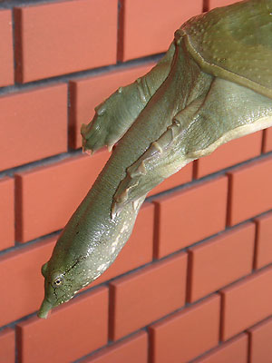 首を長く伸ばして激しく噛み付こうとする。甲羅の最後部を持たなくては指を食いちぎられてしまう。水槽には危険防止のために丈夫な金網をかけ、子供が空けないようにシリンダー錠を付けている。性格はかなり獰猛だが、人懐っこく餌をねだったりする。