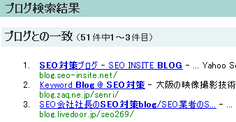 1位、2位は検索エンジンのヤフーとグーグルだが、3位にZAQのブロガリが入ってきている。ブログのもたらすSEO効果ではないだろうか。そして私は知らなかったのだが、ヤフーにブログ検索が出来ていた。13位の「Yhoo! ブログ検索」で「SEO対策 BLOG KEYWORD」や「BLOG SEO対策」を検索したところこのブログがヒットしていた。