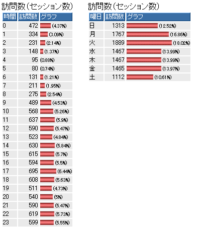 時間別のアクセスは10時〜18時に多く分布し、曜日別では土日が少なく、月曜と火曜に集中している。企業サイトとしては妥当な結果だ。