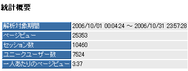 10月のアクセス解析を行った。アクセス数は10460で、ユーザー数は7524である。つまり全体の1/4がリピーターである。ページビューとは閲覧されたページの総数になり、ユニークユーザー数で割ったものが一人当たりの閲覧ページ数となる。