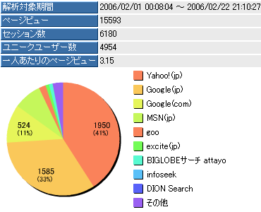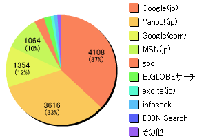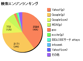 検索エンジン利用状況については登録されているキーワードや順位によって異なり、私のサイトへの検索利用状況がそのまま検索エンジンの利用状況とは言えない。この結果を分析するとMSNの利用が少ないようだが。以前にMSNが最上位になったこともあったが、これは私のサイトのSEO対策が現時点で不十分なため、MSNからのアクセスが少ないといえるだろう。IEにデフォルトのMSNへのSEO対策は最重要になるだろう。MSNのアルゴリズム解析を行わなければならない。