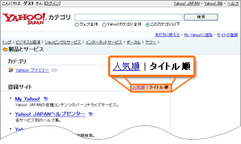 ヤフー登録サイトでのランキングがアップした。検索キーワードではなく、リンク元URLの解析から判った。リンク元はトップ > ビジネスと経済 > 企業間取引 (BtoB) > インターネットサービス > コンテンツ制作 > である。どうもこの人気順というものが判らない。おそらくヤフーでアクセス解析を行って決定しているようだが不明だ。一応ヤフーではこういう風に言っている。