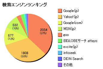 Google(jp)37%、Yahoo!(jp)33%、Google(com)12%、MSN(jp)10%となり、Google(jp)(com)の合計が49%と半数を占めている。これはGoogleの利用者が多いということではなく、SVS.NE.JPがGoogleに最適化しているための結果である。そういう観点からいうとMSNに対しては十分なSEO対策がなされていないといえる。