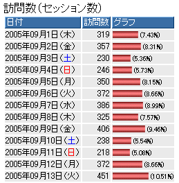 先の書き込みのアクセス数だが、仕事始めの4日は367アクセスで、ページビューは775ページに達していた。気になる年頭挨拶の閲覧数は96であった。ちなみに私が使っているアクセス解析プログラムは羽田野太巳さんの高機能アクセス解析CGI Professional版で法人・商用利用 \2,100(税込)/サイトのシェアウエアだ。もちろん料金は払っている。多くのSEO対策業者も採用しているものだが非常に優れている。同じソフトウエアも個人利用であれば \1,050(税込)/サイトとなっている。また高機能アクセス解析CGI Standard版はフリーウエアとなっている。太っ腹の太巳さんである。アクセス解析に興味のある方は是非 futomi's CGI Cafe を訪れていただきたい。
