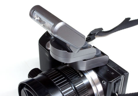 そこで登場するのが、以前このFieldReportで紹介したストロボのエクステンション。本来は次の写真のようにレンズやフードがストロボの光を遮らないようにするためのもの。